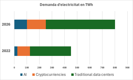 Gràfic 1- Consum mundial d’energia de la IA, criptomonedes i centres de dades. Font: Agencia Internacional de l’Energia