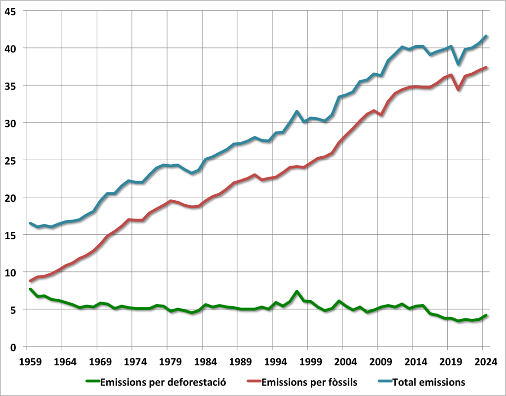Així, quan a les emissions provinents de la desforestació i els canvis d’ús del sòl s’afegeixen les de l’ús de combustibles fòssils, les emissions totals mundials de CO₂ per al 2024 arriben als 41,6 mil milions de tones de CO₂. Aquest volum total d’emissions per al 2024 representa un increment del 2,5 % respecte al 2023, i les projeccions indiquen que les emissions anuals globals de CO₂ continuaran augmentant en els pròxims anys, almenys fins al final d’aquesta dècada. Aturar aquest increment abans del que preveuen les actuals projeccions és un repte crític per, almenys, desaccelerar l’actual procés d’escalfament global i avançar cap a un model energètic i ambiental més sostenible.