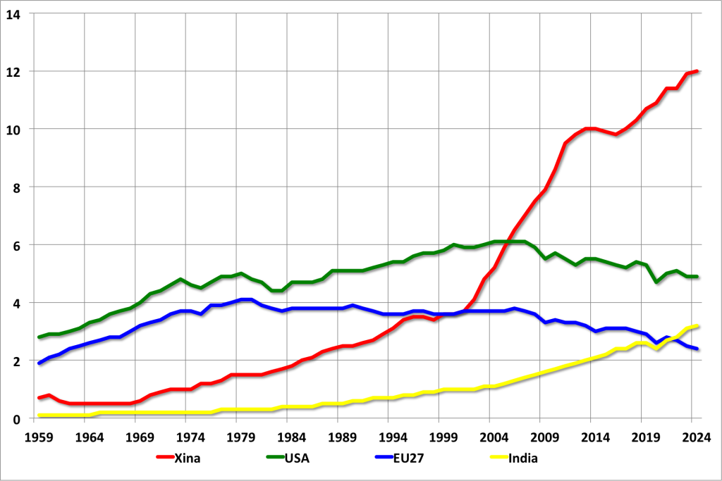 Pel que fa a la Xina, les seves emissions de CO₂ provinents de combustibles fòssils continuen sent significativament més altes que les de l’Índia. El gegant asiàtic és el major emissor mundial de diòxid de carboni, principalment a causa del seu elevat consum de carbó, que el converteix en el màxim consumidor d’aquest combustible a escala global. L’any 2024, la Xina va generar 12 giga tones de CO₂, cosa que representa aproximadament el 32% de les 37,4 giga tones emeses arreu del món pel consum de combustibles fòssils. Aquesta dada subratlla el paper central de la Xina en el panorama global d’emissions de CO₂.