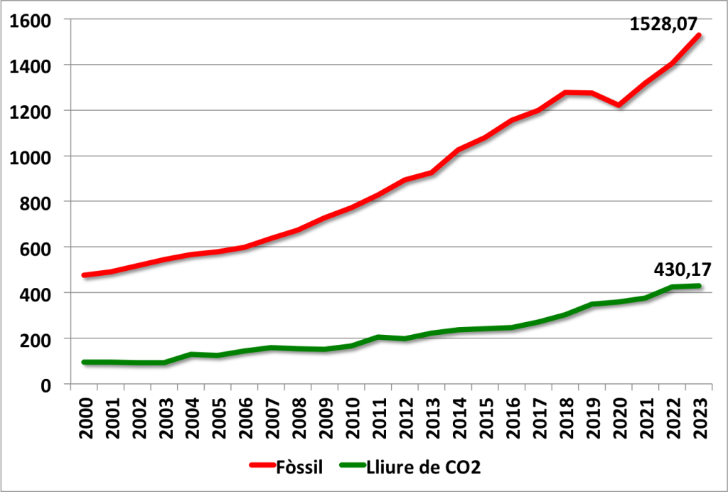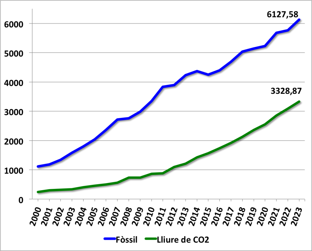 Amb les dades del 2024 a les nostres mans, es confirma que l’ús dels combustibles fòssils, lluny de disminuir, ha tornat a augmentar a escala global. En conseqüència, les emissions anuals de CO₂ també han continuat augmentant, agreujant l’escalfament climàtic global i la freqüència dels fenòmens meteorològics extrems a tot el món.