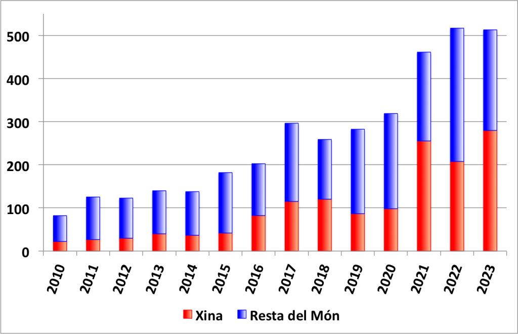 Tanmateix, val la pena destacar que, malgrat la seva posició com a principal emissor mundial de CO₂, la situació energètica de la Xina presenta una paradoxa interessant. D’una banda, la seva alta demanda energètica la converteix en el màxim consumidor mundial de carbó, que representa el 56% de la seva generació elèctrica. Però, d’altra banda, la Xina és, de llarg, el principal inversor internacional en energies renovables d’una manera destacable. Un exemple clar d’això és que, recentment, la Xina ha liderat de manera constant la instal·lació anual de nova capacitat renovable fins al punt que, el 2023 i el 2024, la Xina va afegir més de la meitat de la nova capacitat de generació solar i eòlica instal·lada a tot el món a la seva xarxa elèctrica. Aquest esforç sostingut ha convertit la Xina en el major productor mundial d’electricitat a partir de fonts renovables.