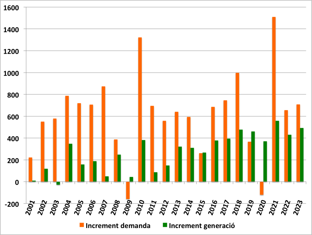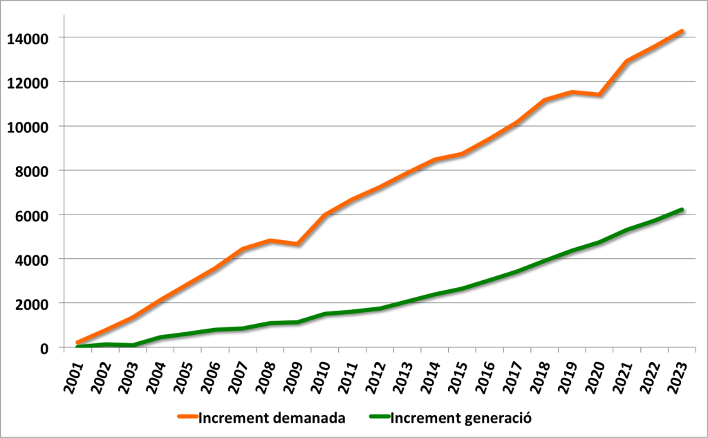 Tot i que la producció d’energia amb tecnologies renovables creix de manera constant i a un ritme cada cop més ràpid, aquest augment és insuficient per satisfer l’increment de la demanda energètica global, que continua augmentant any rere any. Això significa que el món necessita més energia cada any en lloc de reduir les necessitats energètiques anuals. Tal com es mostra als gràfics 9 i 10, hi ha un desequilibri clar entre la capacitat global d’afegir nova generació d’energia renovable anualment i l’increment més significatiu en la demanda energètica. Tot i que les inversions anuals en energia renovable estan creixent, l’energia necessària augmenta més ràpidament que la capacitat de produir-la amb les fonts netes instal·lades. Això provoca una bretxa acumulativa cada any entre els nous TWh que el món necessita i els nous TWh que el món pot generar amb fonts renovables. Aquest fenomen fa que l’objectiu de descarbonitzar el sistema elèctric sigui cada cop més difícil d’assolir. Aquesta realitat posa de manifest la necessitat d’intensificar les accions per equilibrar la balança entre la generació d’energia renovable i la demanda energètica.