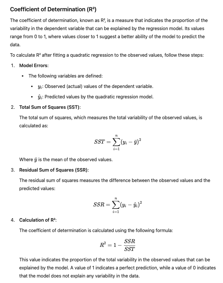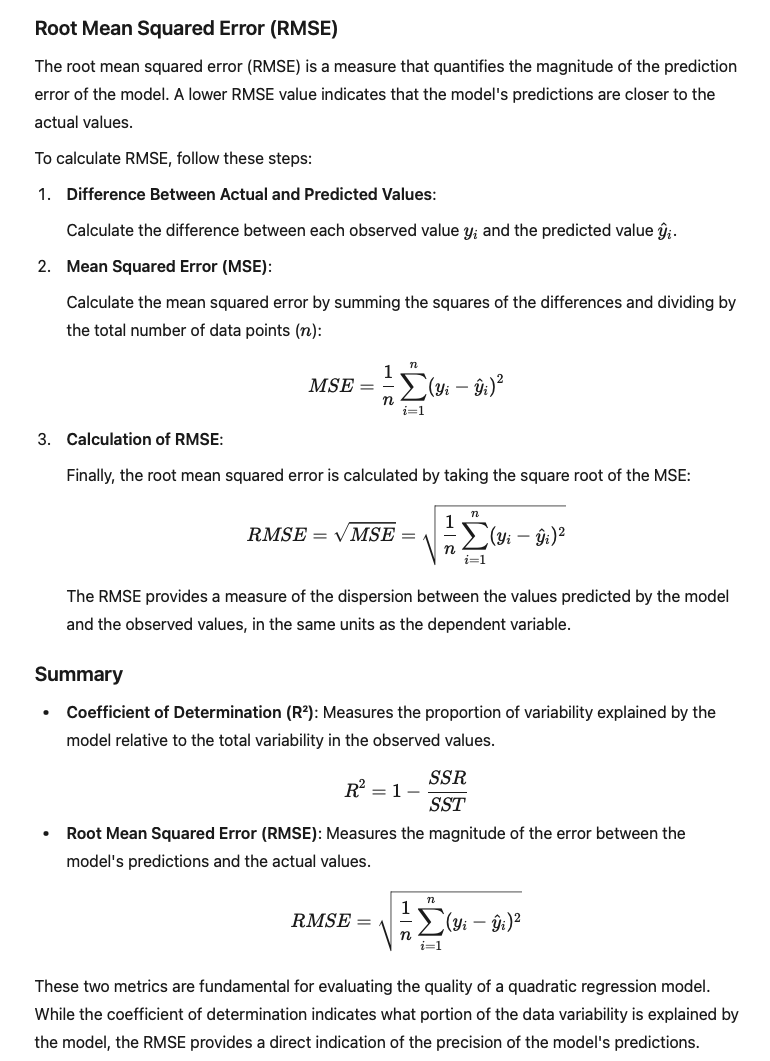 Once the quadratic regression models are calculated, it is essential to validate the results to ensure they adequately fit the actual data. This validation is key to determining with a certain degree of confidence whether the models are appropriate and can be used for reliable predictions. To this end, two methods are used: the coefficient of determination (R²) and the root mean squared error (RMSE).