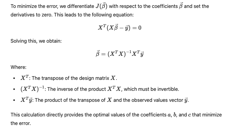 Once it has been determined that the matrix (XTX)-1 is invertible1, and this system is subsequently solved using matrix calculations, the optimal values for the coefficients a, b, and c that minimize the error are directly obtained, as explained earlier: