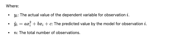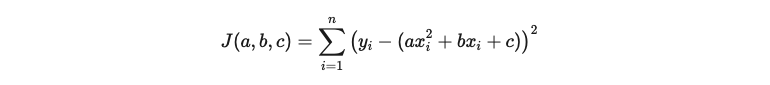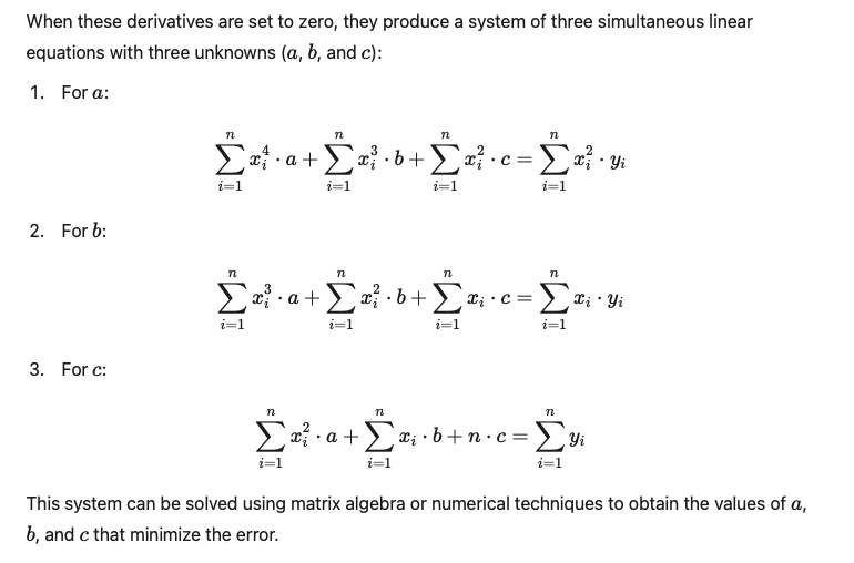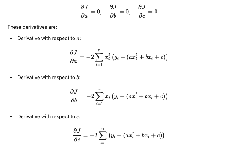 This function J(a, b, c) aims to calculate how well the model fits the real data. In other words, it seeks the values of coefficients a, b, and c that make the cost function J(a, b, c) minimal and best define the quadratic curve that most closely matches the actual data. To achieve this, it is necessary to derive the cost function for each of the coefficients of the parabolic equation and set these derivatives equal to zero. This generates a system of equations that can be solved as follows: