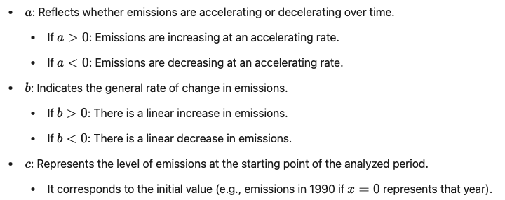 Quadratic regression is a widely used statistical method for its simplicity in finding a relationship between two variables: an independent variable X (in this case, years) and a dependent variable Y (CO₂e emissions). This method is very useful for predicting behaviors, especially when this relationship is not linear but follows a curved shape. It is a simple but powerful statistical tool for analyzing data with non-linear trends. It is especially useful when capturing complex patterns and better understanding trends without delving into more complex multivariable models.
