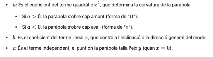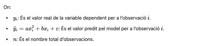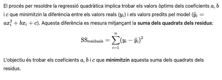 El mètode utilitzat per ajustar el model és el dels mètodes dels mínims quadrats, que consisteix a trobar els coeficients a, b, i c de l’equació parabòlica que minimitzen la suma dels quadrats dels residus. Això significa que el model que es busca ha de fer que l’error global sigui el més petit possible.