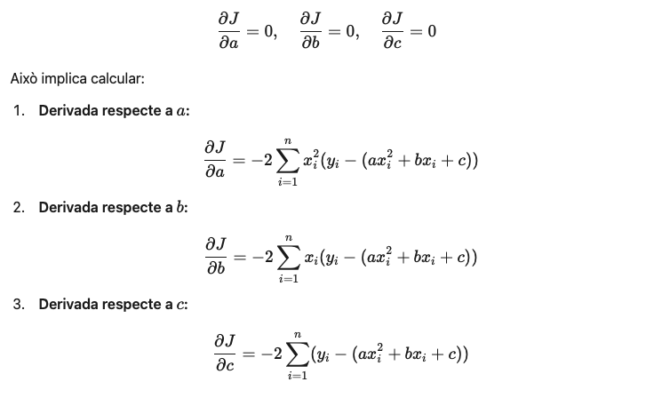 Aquesta funció J(a,b,c) el seu objectiu és el de calcular com el model s’ajusta les dades reals. En altres paraules, trobar els valors dels coeficients a, b, i c que fan que la funció de cost J(a,b,c) sigui mínima i que, per tant, siguin aquests els que millor defineixen la corba quadràtica que coincideixi al màxim amb les dades reals. I per això, és necessari derivar la funció de cost respecte a cadascun dels coeficients de l’equació parabòlica i igualar les derivades a zero. Això genera un sistema d’equacions que es pot resoldre de la següent manera: