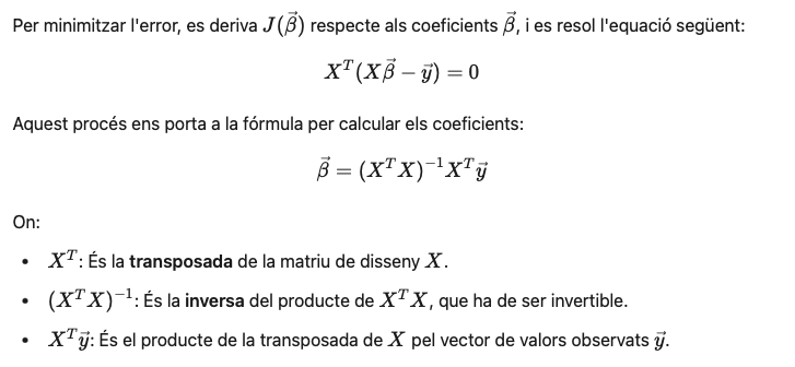 Un cop tenim el sistema matricial establert, el següent pas és el de trobar, mitjançant càlcul matricial quins són els valors òptims dels coeficients a, b, i c que minimitzen l’error entre la diferència dels valors observats i els predits pel model.