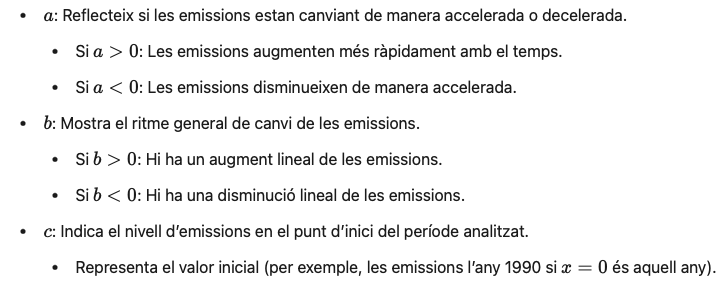 La regressió quadràtica és un mètode estadístic molt utilitzat per la seva simplicitat per trobar una relació entre dues variables, una variable independent X (en aquest cas, els anys) i una variable dependent Y (les emissions de CO₂e). Aquest mètode és molt útil per predir comportaments, especialment quan aquesta relació no és lineal sinó que segueix una forma de corba. Es tracta d’una eina estadística simple, però molt potent, per analitzar dades amb comportaments no lineals i és especialment útil quan volem capturar patrons complexos i entendre millor les tendències, sense entrar en models multivariables més complexos.