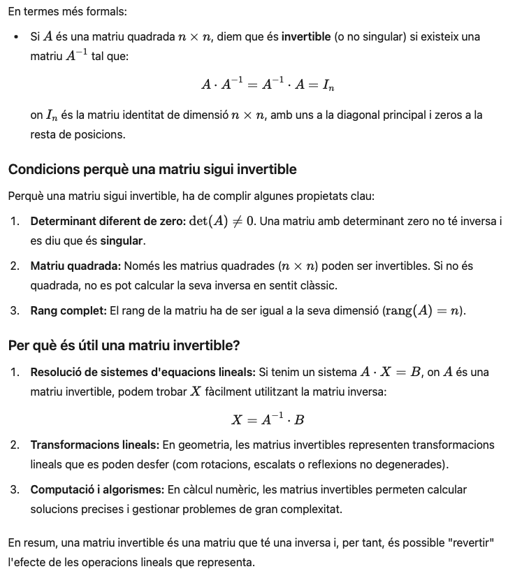 - Que una matriu sigui invertible significa que existeix una altra matriu, anomenada matriu inversa, que quan es multiplica per la matriu original dona com a resultat la matriu identitat. Aquesta propietat és fonamental en àlgebra lineal i té implicacions importants en la resolució de sistemes lineals d’equacions, entre altres aplicacions.