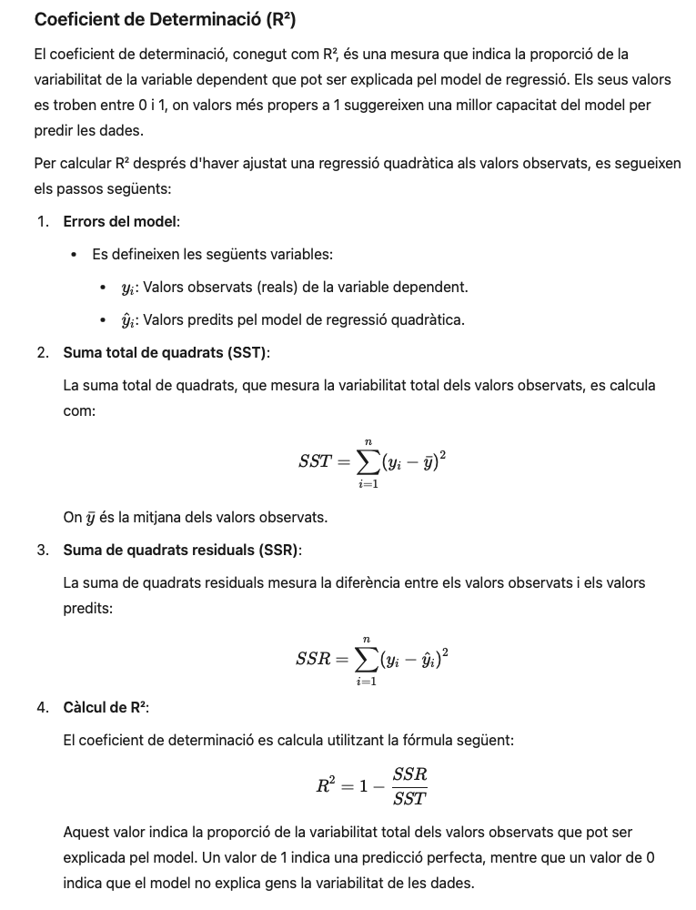 Un cop calculats els models de regressió quadràtica, és imprescindible validar els resultats per assegurar que aquests models trobats s’ajusten adequadament a les dades reals. Aquesta validació és clau per determinar amb un cert grau de confiança si els models són adequats i poden utilitzar-se per fer prediccions fiables. Per aquesta fi, es fan servir dos mètodes: el del coeficient de determinació (R²) i l’arrel de l’error quadràtic mitjà (RMSE, per les seves sigles en anglès).