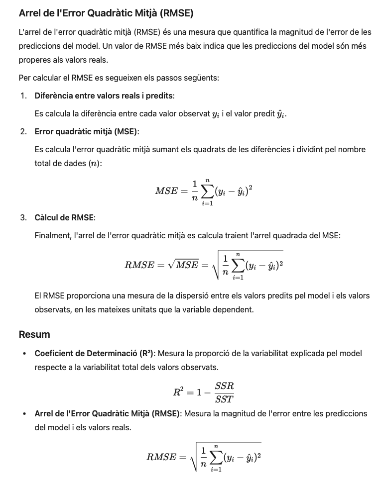 El R² i el RMSE són dos mètodes àmpliament utilitzats en estadística per avaluar la qualitat d’un model matemàtic. El R² (coeficient de determinació), indica quina part de la variabilitat de les dades reals és explicada pel model. Un valor proper a 1 significa que el model explica molt bé les dades, mentre que un valor proper a 0 indica que hi ha poca relació entre el model i les dades reals. En canvi, el RMSE (l’Arrel d’Error Quadràtic Mitjà), mesura, de mitjana, l’error del model en les seves prediccions. Expressat en les mateixes unitats que les dades, el RMSE ens mostra fins a quin punt les prediccions del model s’allunyen dels valors reals.